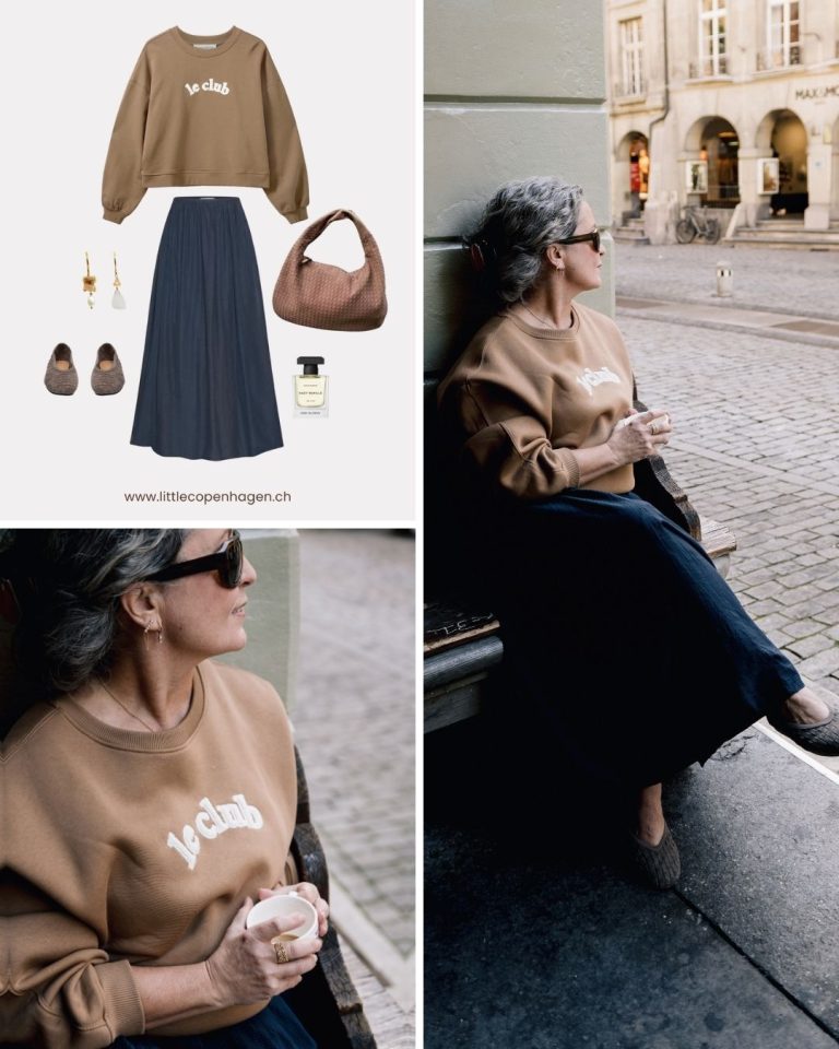 Kombiniere ihn mit einem sportlichen Camel – Farbigem Sweatshirt mit „Le Club“-Schriftzug.