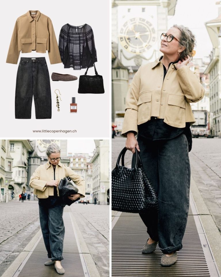 Schwarze Barrel-Jeans sind das neue Statement-Piece. Dazu eine leicht transparente Bluse mit Stickereien – feminin, aber nicht brav.
