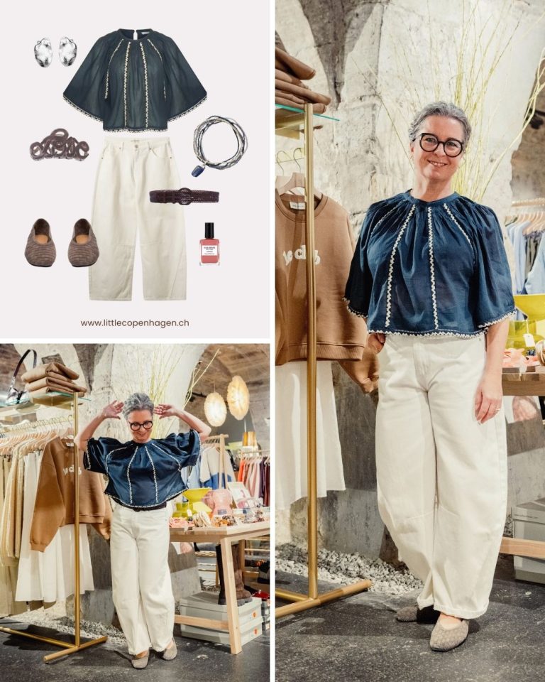 Dazu eine feminine Bluse mit Stickereien und ausgestellten Ärmeln.