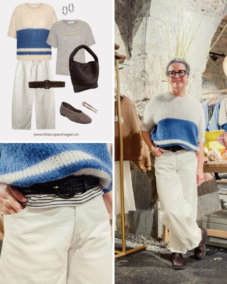 Weisse Barrel Jeans als Basis. Darüber ein kurzärmliger Strick in Weiss mit dicken blauen Streifen.