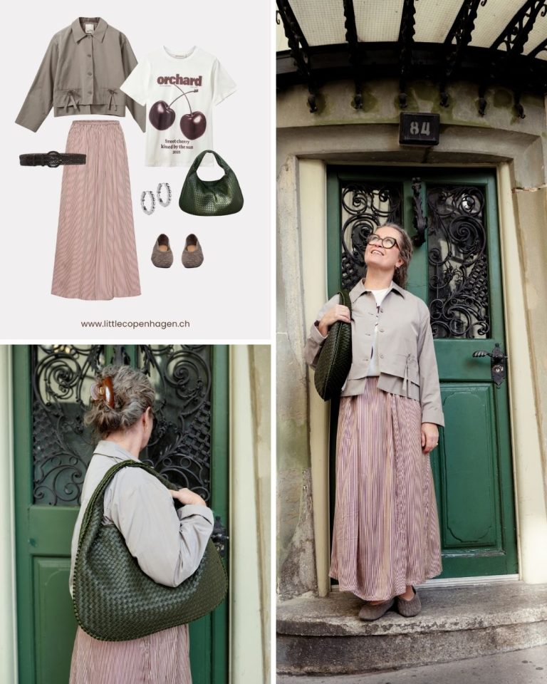 Der rot gestreifte Rock bringt Energie, das Cherry-T-Shirt setzt einen verspielten Akzent und die leichte graue Jacke mit Schleifen-Details nimmt dem Look die Lautstärke und macht ihn tragbar für jeden Tag.