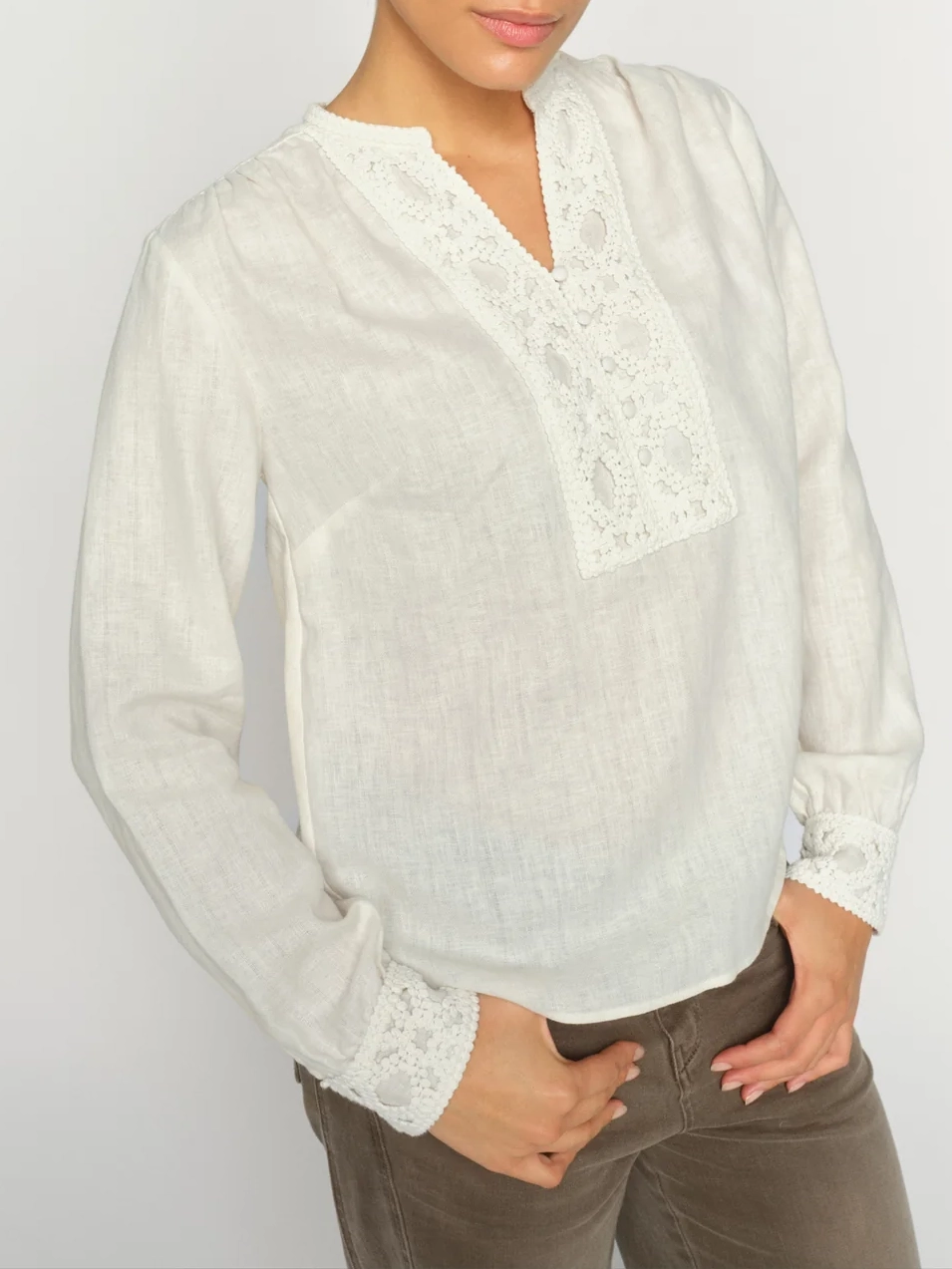 Eine wunderschön gearbeitete Bluse aus einem weichen Leinen-Baumwoll-Gemisch. Der lockere Schnitt und die zarte Lochstickerei an Ausschnitt und Manschetten verleihen der natürlichen Textur eine elegante Note. Kombinieren Sie sie mit einer eleganten Hose oder Jeans für einen raffinierten und dennoch unkomplizierten Look.