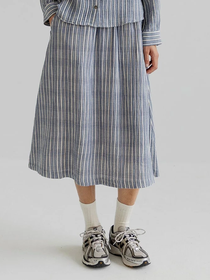 MAGGIE ist ein Waffel-Baumwollrock von Project AJ117 mit gerader, entspannter Silhouette und elastischem Bund für eine bequeme Passform. Gestaltet mit Taschen an den Seiten und einem dezenten Saumdetail. Der Stoff stammt aus Italien und zeigt auf der einen Seite Streifen und auf der anderen Seite Karomuster. Der Rock ist nicht reversibel, aber beide Optionen sind verfügbar. Die feine Garnkonstruktion erzeugt eine weiche Textur mit einem leichten, luftigen Gefühl. Kann mit dem passenden Madden- oder Melanie-Shirt kombiniert werden, um einen kompletten Look zu erzielen.