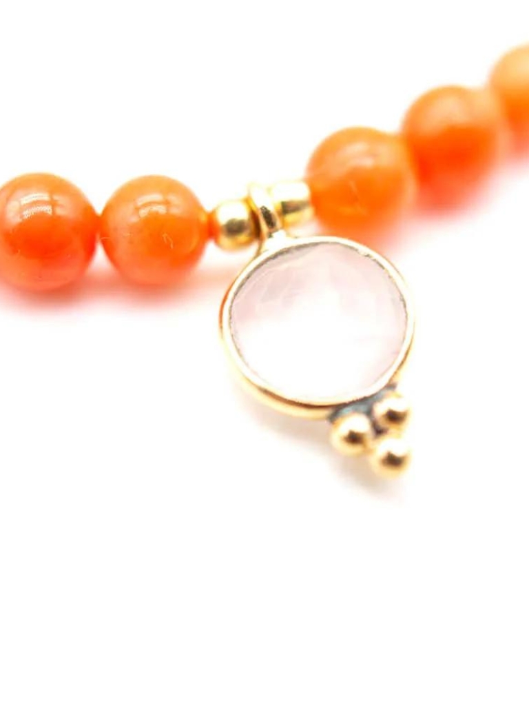 Armband auf Elastikband mit Sterlingsilber vergoldet, Kristallperlen, Rhodonit, Howlith, Koralle und Rosenquarz-Anhänger