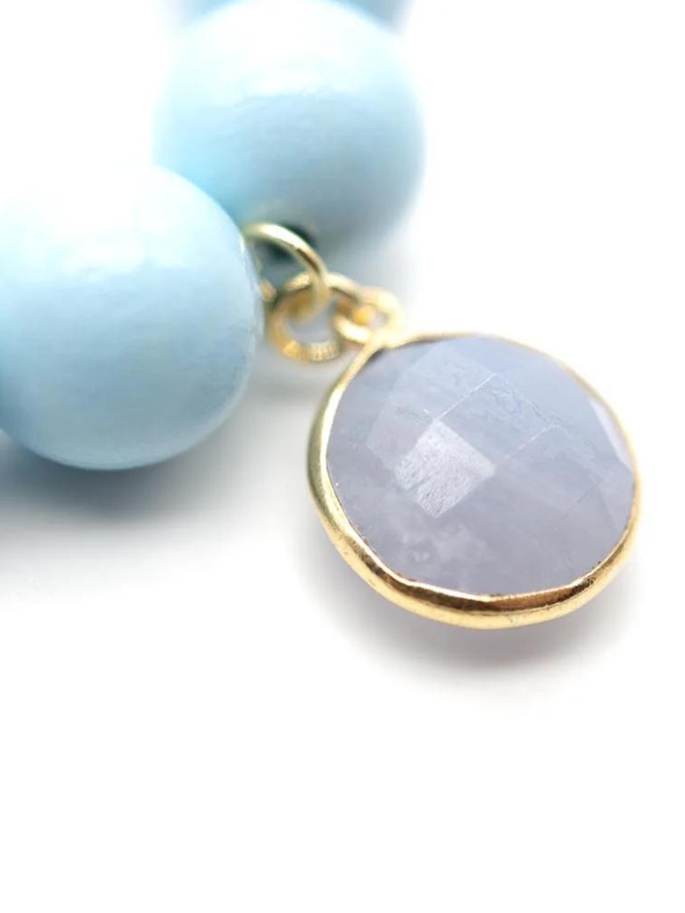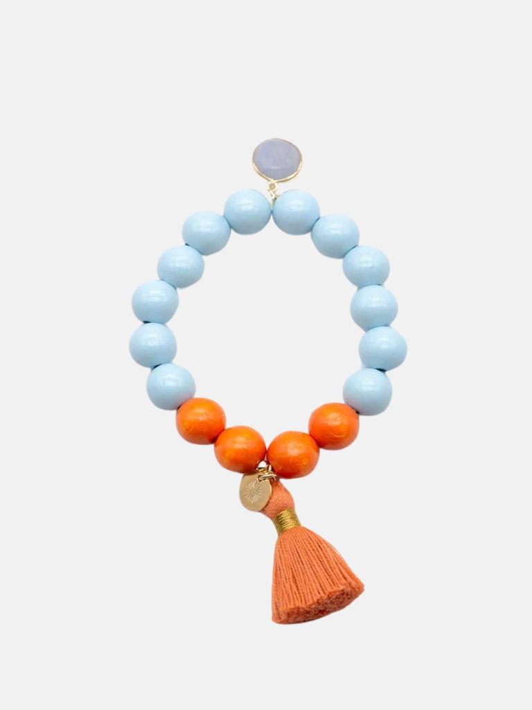 Armband auf Elastikband, Sterlingsilber vergoldet, Holzperlen 12mm blau und orange, Achat-Anhänger und Quaste