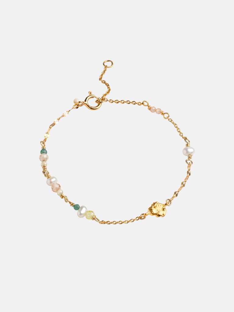 Geschmückt mit Perlen und Steinen in Grün-, Pfirsich- und Weisstönen, sieht das Lucie Armband total leicht und schön aus. Die rohen Goldelemente und der asymmetrische Look von Lucie verleihen Ihrem Outfit eine besondere Note, da alle Elemente zusammen glänzen.