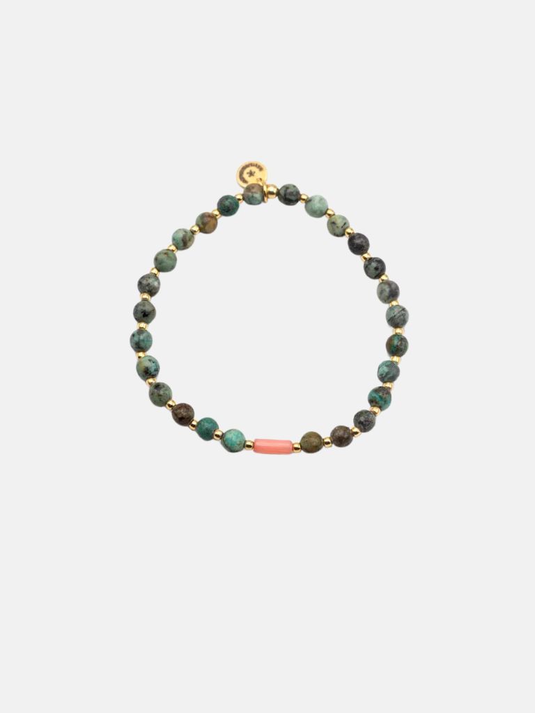 Armband auf Elastikband mit Sterlingsilber vergoldet und Perlen aus Amazonit und Türkis mit Onyx-Anhänger