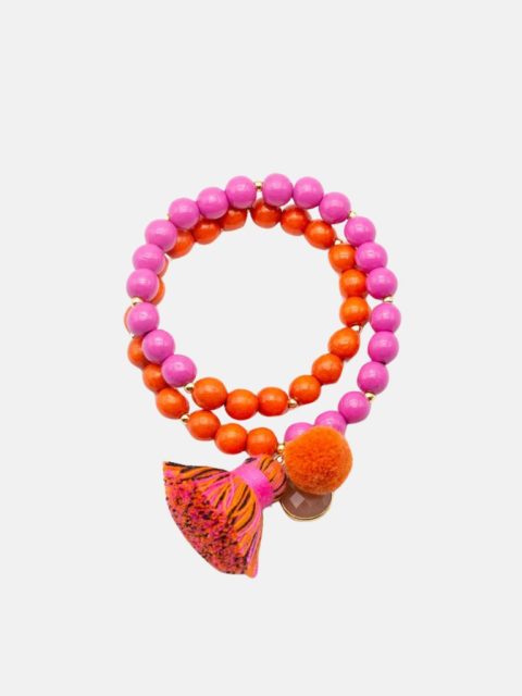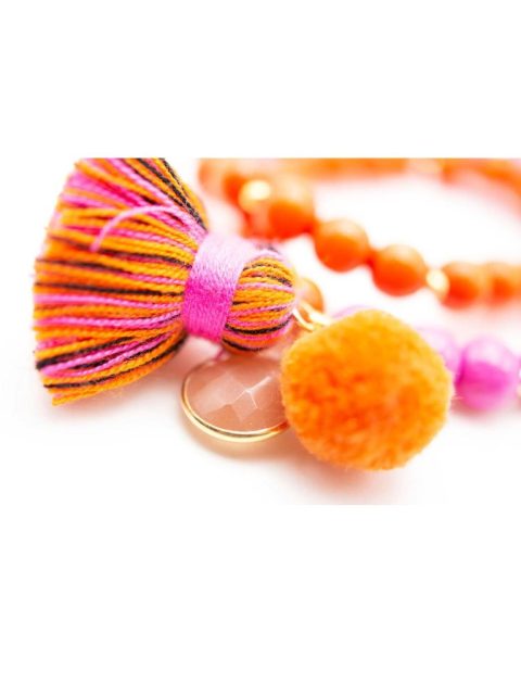 Armband Mala doppelt auf Elastikband. Sterlingsilber vergoldet. Holzperlen. Mondstein-Anhänger. Quaste und Pompom.