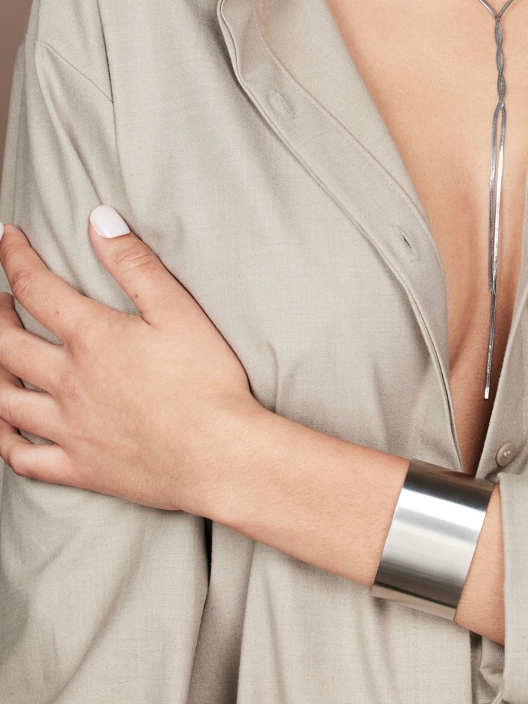 Silberfarbene, breite Armspange mit matter Oberfläche. Die Breite der Armspange beträgt 3,8 cm und ist größenverstellbar, sodass sie nahezu immer passt. Versilbert auf langlebigem Edelstahl.