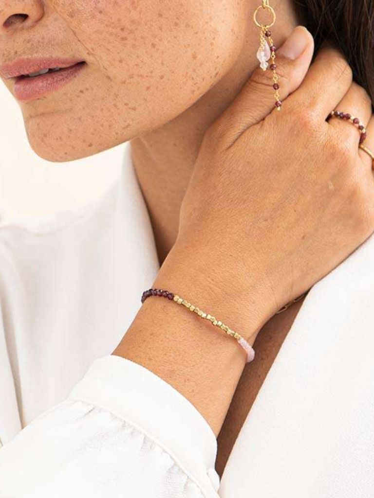 Der neue Armreifen von a beautiful story verfügt über Messingperlen, kleine Granat- und Rosenquarz-Edelsteine sowie einen vergoldeten Verschluss.