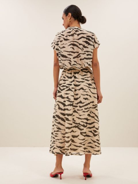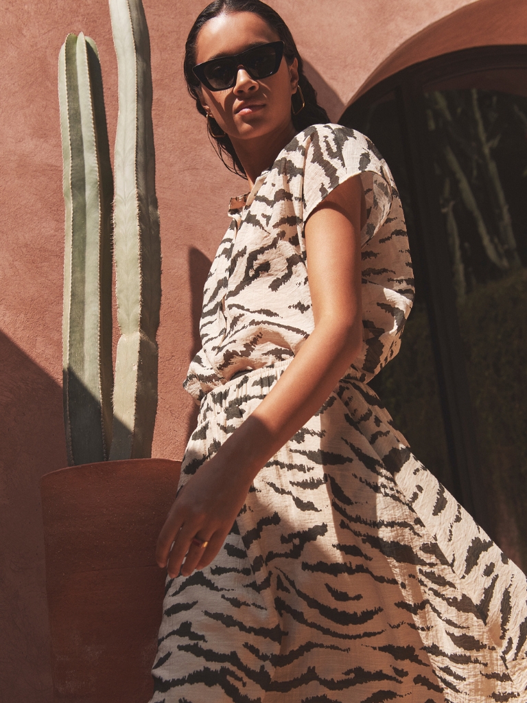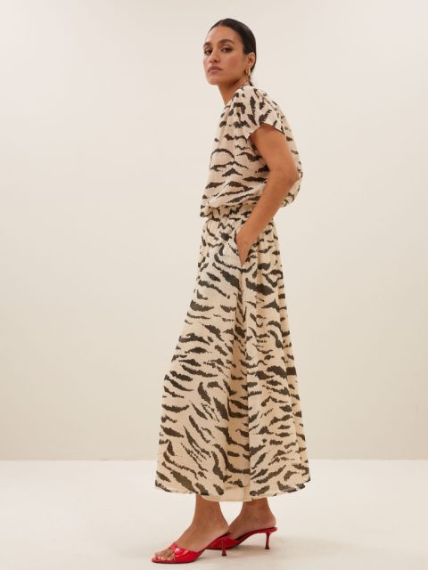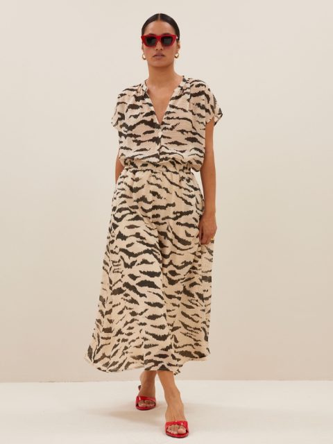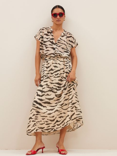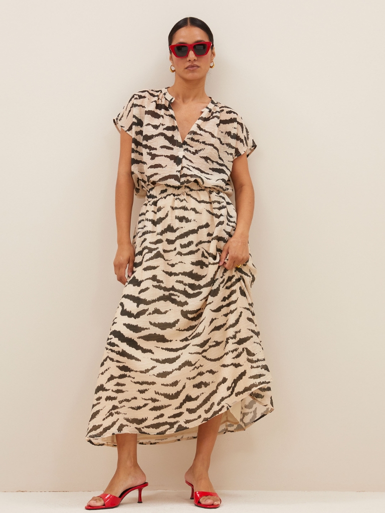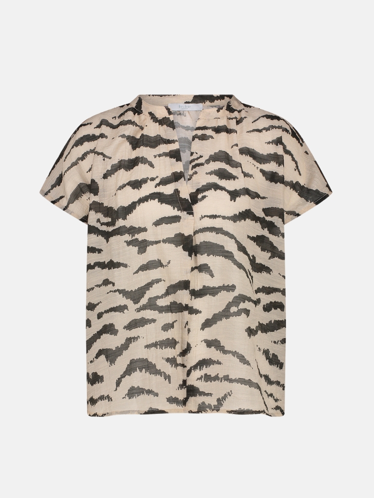 Füge deinem Kleiderschrank einen Hauch von Stil mit der amie zebra blouse in einem sand zebra print hinzu! Diese Bluse mit einer lockeren Passform und einem eleganten V-Ausschnitt ist perfekt für jeden Anlass. Hergestellt aus ecovero lenzing viskose, fühlt sich der Stoff wunderbar weich auf deiner Haut an.
