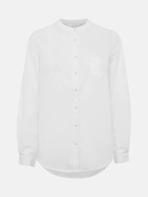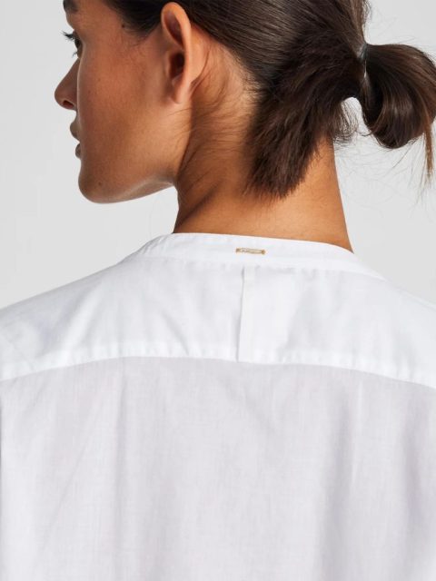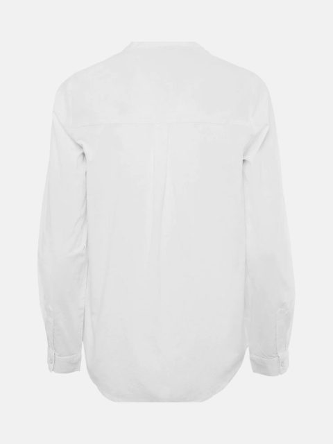 Wunderschöne Basic Bluse in Weiss aus Bio Baumwolle. Die Bluse hat eine normale Passform und einen kleinen Stehkragen. Perfekt mit Jeans oder anderen Stoffhosen. Der Kragen hat hinten einen Knopfeingang.