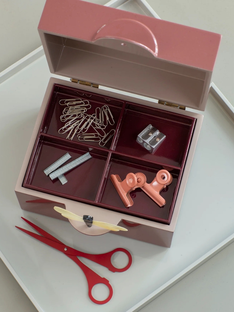Im Inneren sorgt ein herausnehmbares Tablett mit kleinen Fächern für eine übersichtliche Aufbewahrung von Schmuck, Accessoires oder anderen kleinen Gegenständen. Die Aussenseite ist in einem intensiven Passion-Ton gehalten, während das Innere in Cashmere gestaltet ist. Das Tablett in Bordeaux setzt dabei einen eleganten, tiefen Farbakzent.