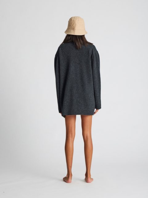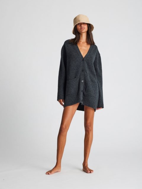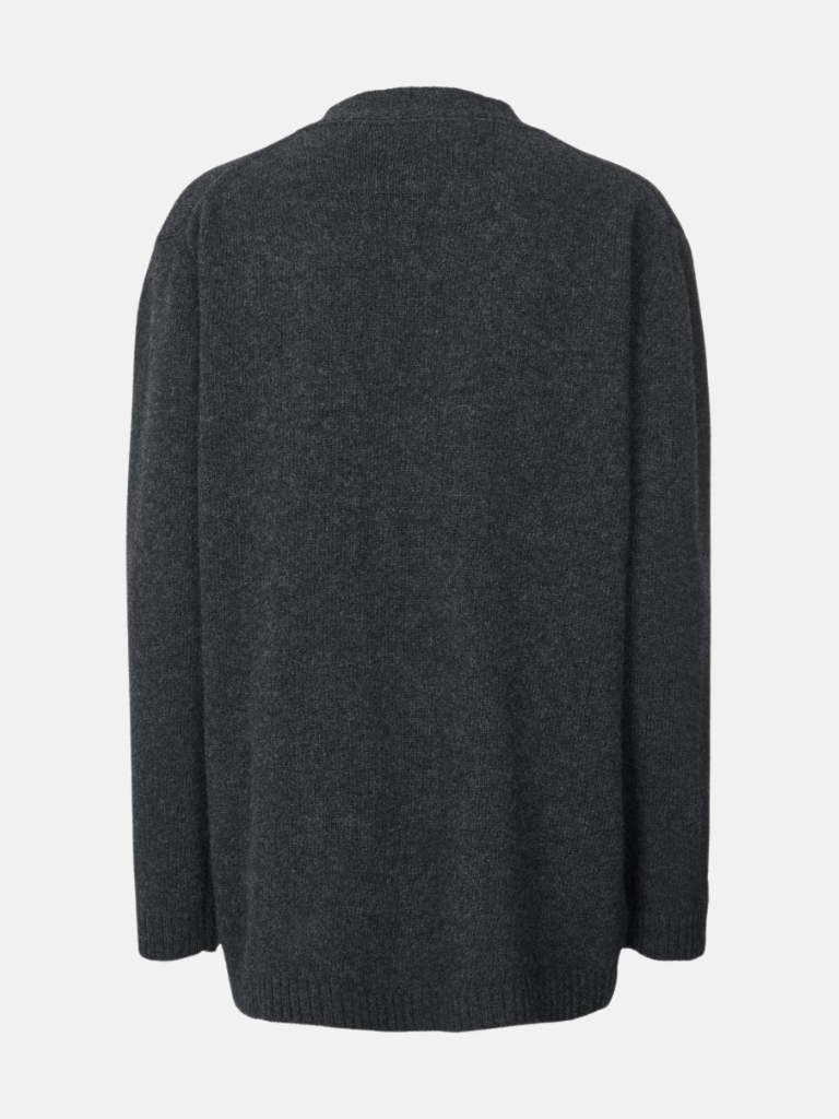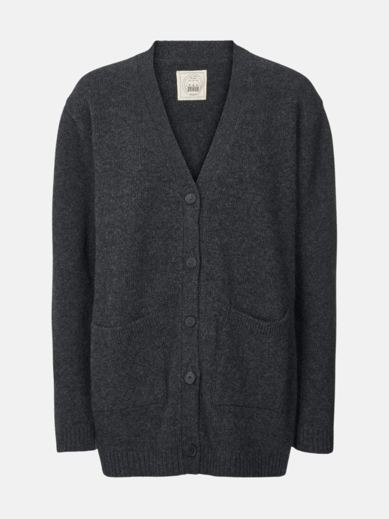 Alba ist eine lange, durchgehende Strickjacke aus 100 % Lammwolle. Diese gestrickte Jacke hat einen V-Ausschnitt und zwei vordere Taschen. Alba verfügt über Rippbündchen an den Ärmeln, am Saum und an den Taschen.