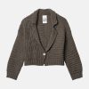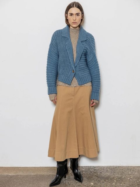 Die strukturierte Strickoptik verleiht ihr Ausdruck, während der Einknopfverschluss die Silhouette schlicht und mühelos wirken lässt.