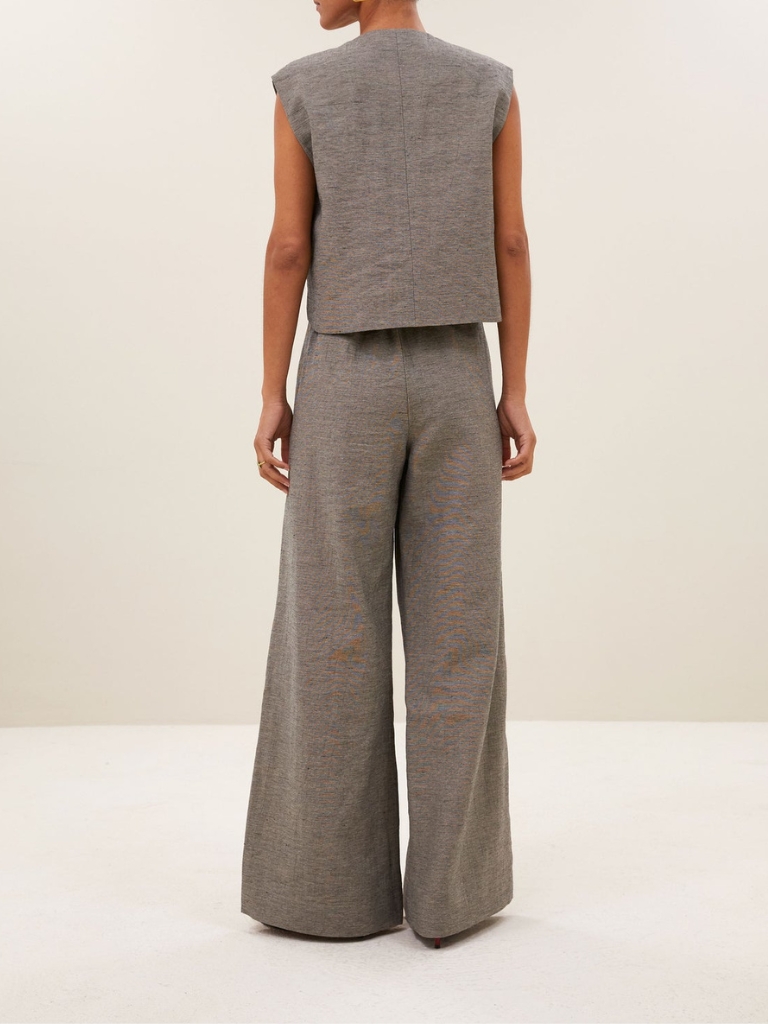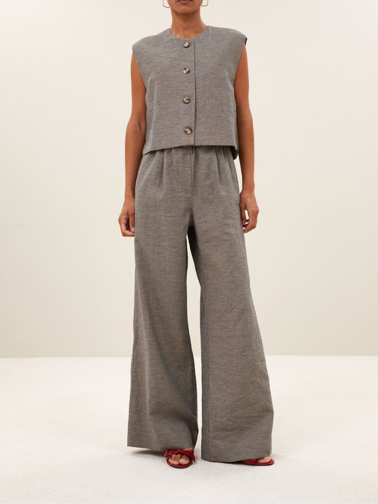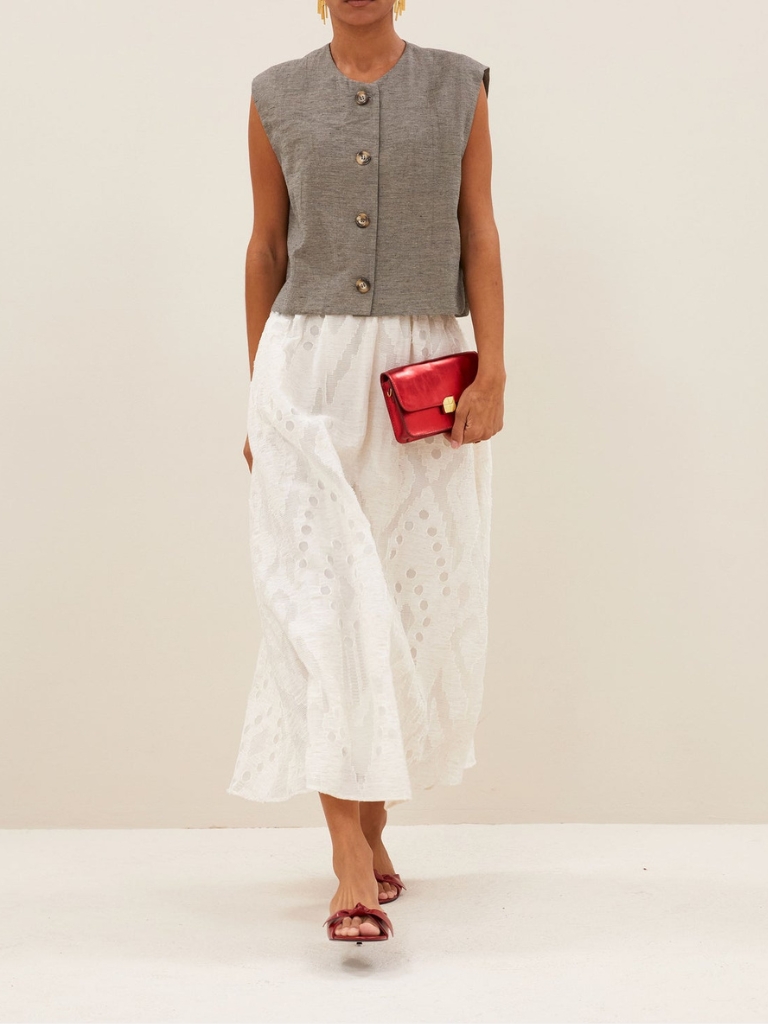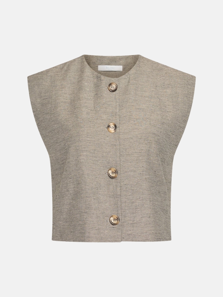 Der Knopfverschluss sorgt für ein unkompliziertes An- und Ausziehen und macht das Gilet zu einem vielseitigen Styling-Piece. Ob über einer Bluse, einem Shirt oder solo getragen – es lässt sich mühelos kombinieren und begleitet dich stilvoll vom Tag in den Abend.