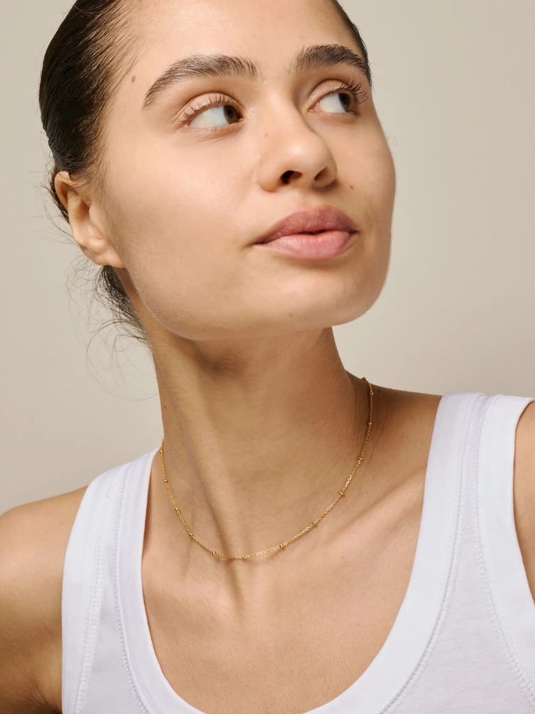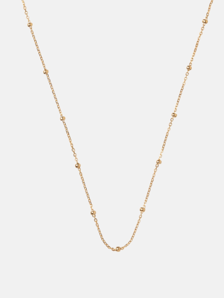 Die Beaded Chain Necklace ist eine feine, elegante Kette mit kleinen goldenen Perlen, die ihr einen leichten und zugleich edlen Ausdruck verleihen. Durch ihr schlichtes Design ist sie ein vielseitiger Alltagsfavorit – solo getragen wirkt sie dezent und feminin, in Kombination mit anderen Ketten entsteht ein moderner Layering-Look. Die zarten Perlen setzen subtile Akzente und verleihen der Kette ihren besonderen Charakter. Passend dazu ist auch ein Armband im gleichen Design.