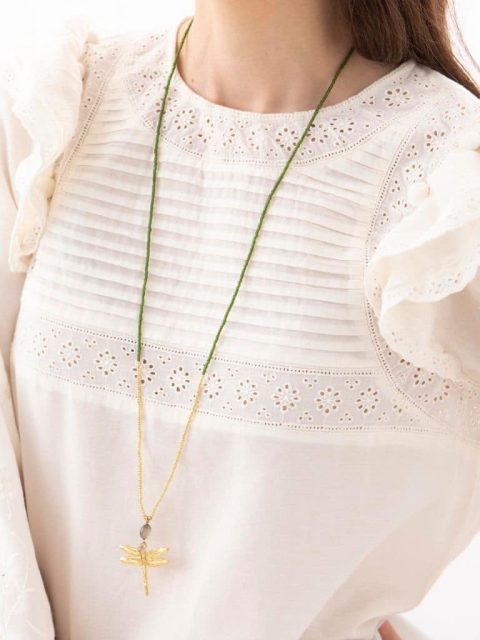 Die Blessing-Labradorit Gold-Halskette von A Beautiful Story ist vergoldet, hat eine Länge von 86 cm und enthält Glasperlen. Diese Halskette trägt einen grossen Labradorit-Edelsteinanhänger und ein Libellensymbol.