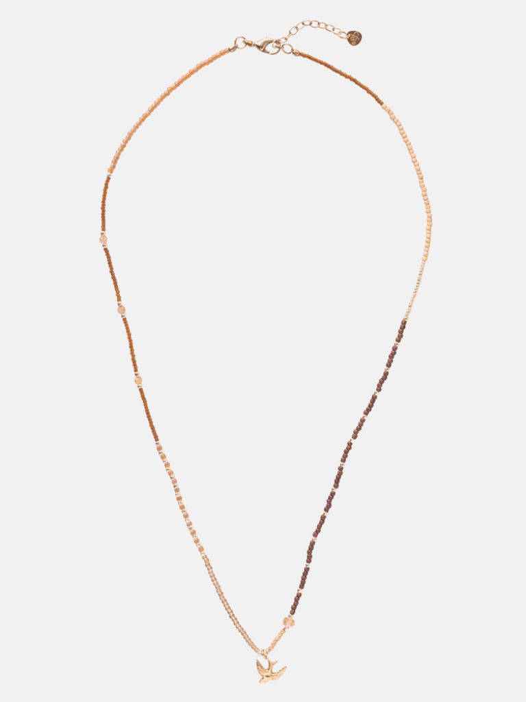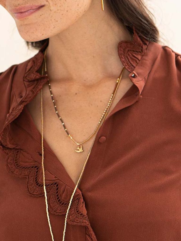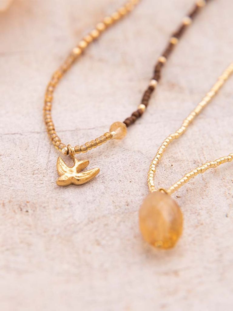 Die Feel Citrine Goldfarbene Halskette von A Beautiful Story ist aus vergoldetem Messing und Glasperlen gefertigt, verfügt über kleine Citrin-Edelsteine und einen vergoldeten Anhänger mit einem Schwalben-Symbol. Die Länge der Halskette beträgt 50-53 cm. Sie kann auch optional als Wickelarmband getragen werden.