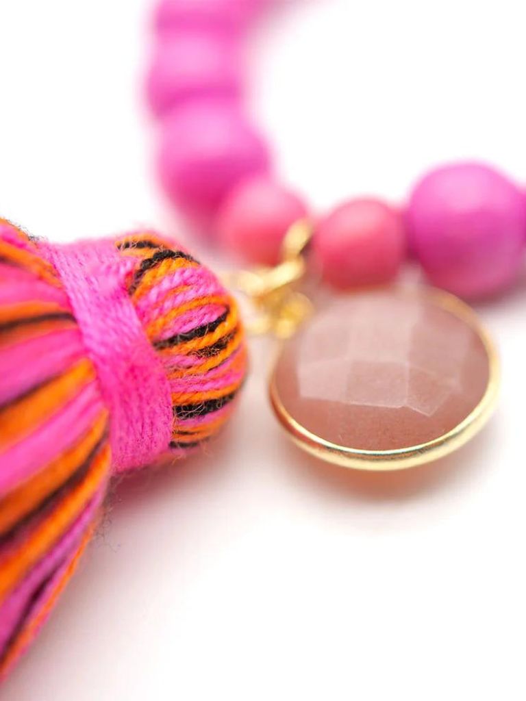 Kette lang mit Sterlingsilber vergoldet, Holzperlen, Rhodonit, Mondstein-Anhänger und Quaste.