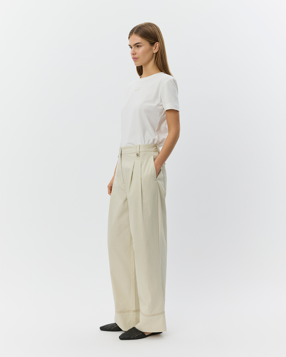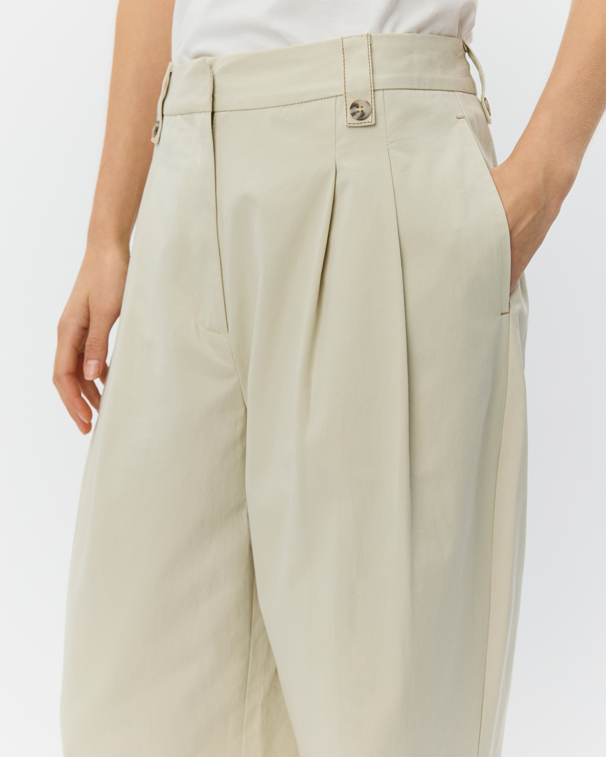 Diese Hose in Light Sand vereint massgeschneiderte Eleganz mit einem lässigen, luxuriösen Tragegefühl. Die zwei Bundfalten vorne sorgen für eine klassische, stilvolle Note, während die weiten Umschläge am Saum dem Look Charakter und Modernität verleihen.