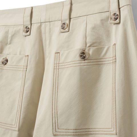Durchdachte Details wie schräge Eingrifftaschen, grosse eckige aufgesetzte Gesäßtaschen mit Knopf sowie Gürtelschlaufen mit Knopfakzenten unterstreichen die hochwertige Verarbeitung. Der Verschluss mit Knopf und Reissverschluss rundet das Design funktional ab.