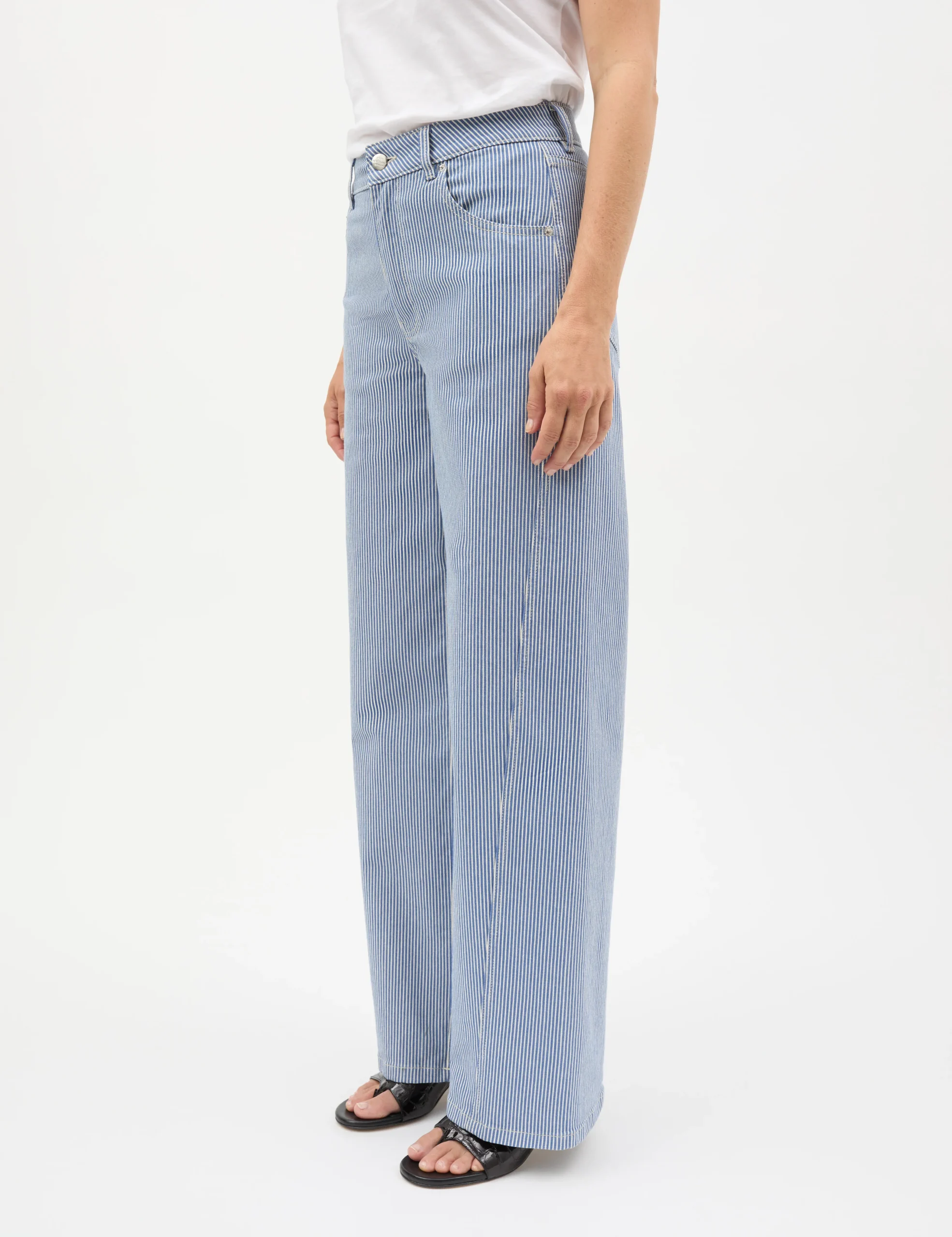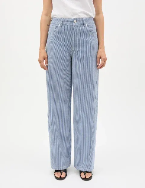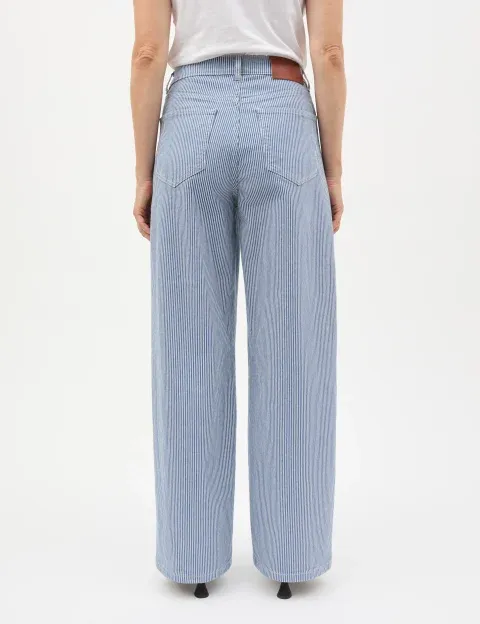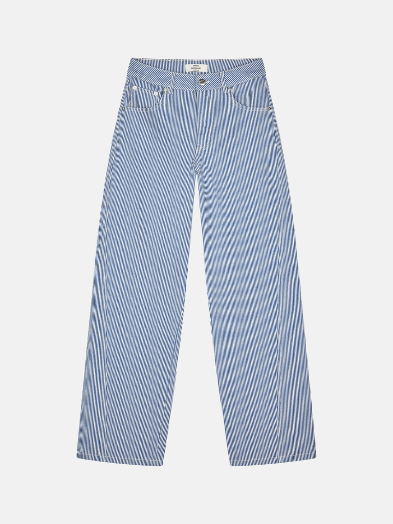 Die Barrel Jeans von Mads Nørgaard präsentiert sich in gestreiftem Denim mit klassischem Five-Pocket-Design, Gürtelschlaufen, mittlerer Leibhöhe und einem definierten Bund. Die gedrehten Nähte sorgen für einen klaren, eleganten Fall und unterstreichen die moderne Silhouette.