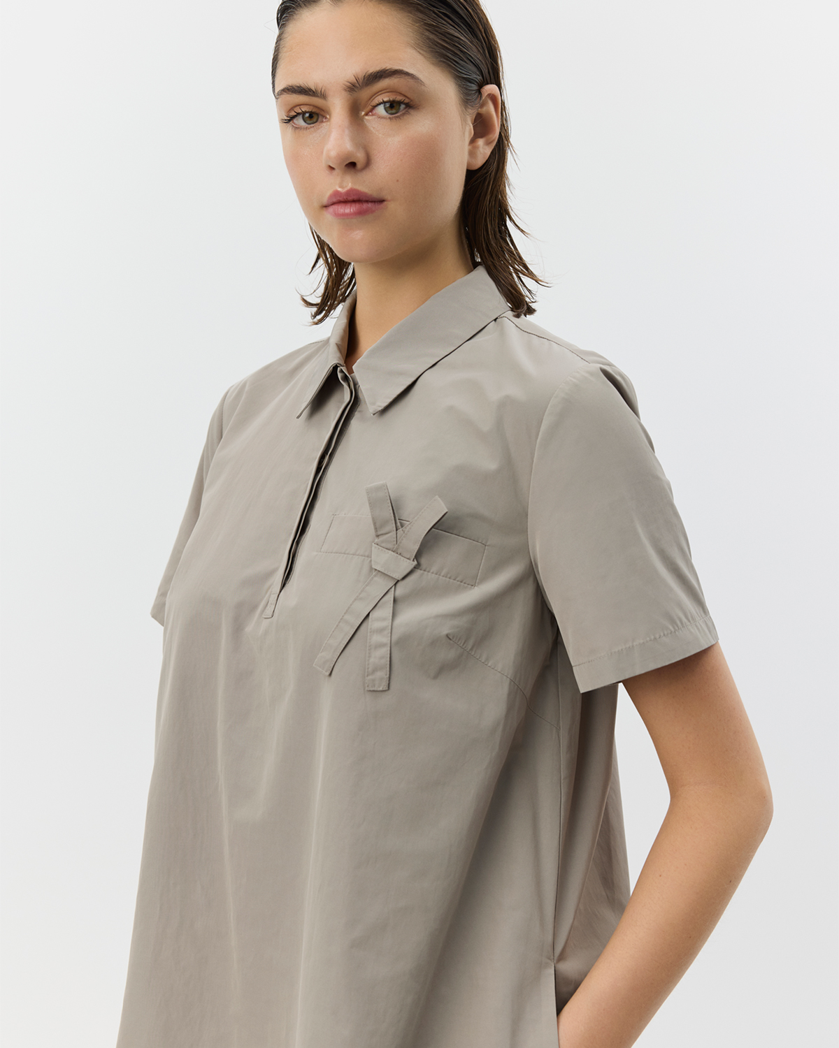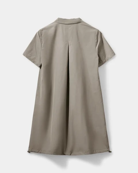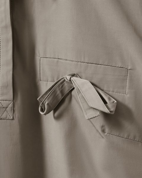 | • Hidden zipper • Decorative pocket with ribbon detail • A-line • Short sleeves • Drawstring at the hem for adjustable fit • Deep, center-placed pleat |