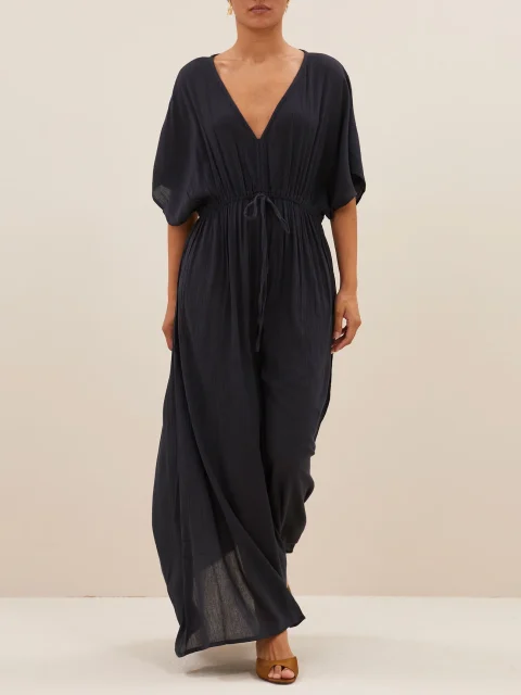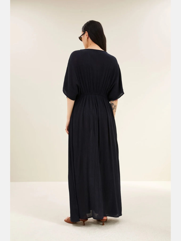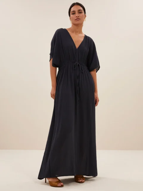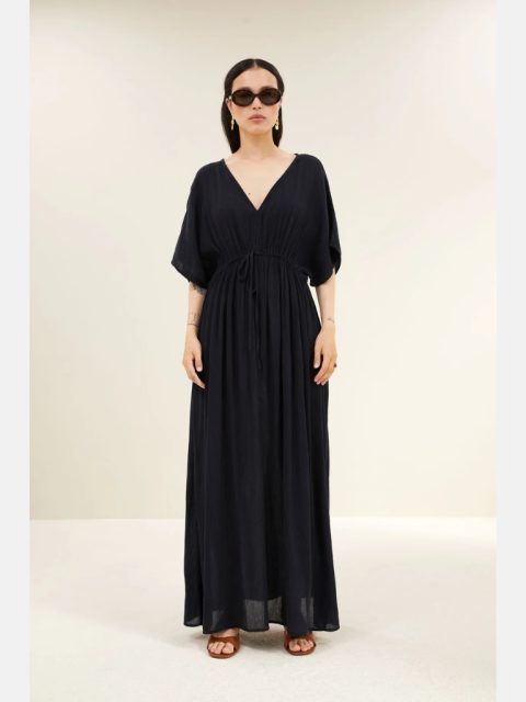 Entdecke die perfekte Mischung aus Komfort und Stil mit diesem langen Kleid. Die lockere Passform und der lässige Schnitt verleihen einen mühelosen Look, während der V-Ausschnitt eine elegante Note setzt. Kurze Ärmel sorgen für ein angenehmes, luftiges Tragegefühl – ideal für entspannte Tage oder casual-chice Anlässe.