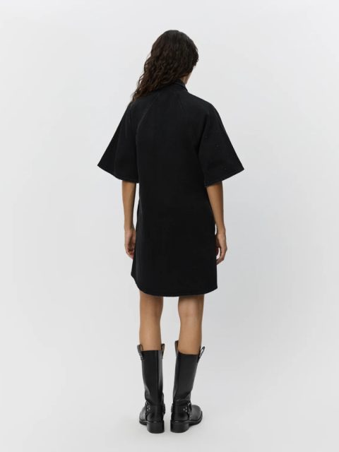 Diese lange Jeansbluse in gewaschenem Schwarz vereint Lässigkeit mit modernen Details. Sie ist mit kurzen Ärmeln, einer praktischen Fronttasche und einer durchgehenden Knopfleiste ausgestattet. Kleine Strassdetails verleihen dem Design einen dezenten, funkelnden Akzent und machen die Bluse zu einem besonderen Hingucker. Ein vielseitiges Stück, das sich sowohl im Alltag als auch zu besonderen Anlässen stilvoll kombinieren lässt.