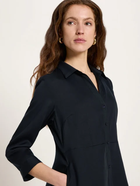 Zeitlose Eleganz trifft auf nachhaltige Innovation: Das Midikleid aus TENCEL™ vereint femininen Stil mit verantwortungsbewusster Materialwahl. Der fliessende Stoff aus TENCEL™ Lyocell sorgt für ein angenehmes Tragegefühl und einen natürlichen Glanz, während der taillierte Schnitt und die durchgehende Knopfleiste eine schmeichelnde Silhouette schaffen.