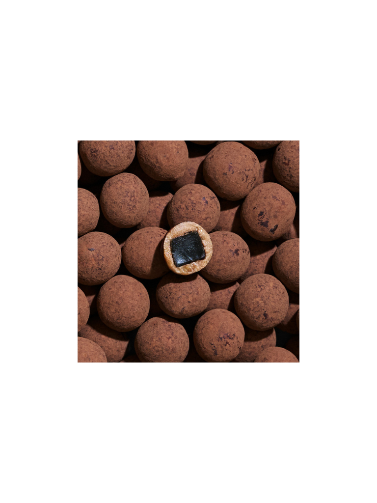 Geniesse süsses Lakritz umhüllt von zarter Schokolade mit kleinen knusprigen Kakaonibs, bestreut mit feinem Kakaopulver. Ein himmlischer Genuss für alle, die den Geschmack von zarter, reichhaltiger Schokolade zu schätzen wissen.