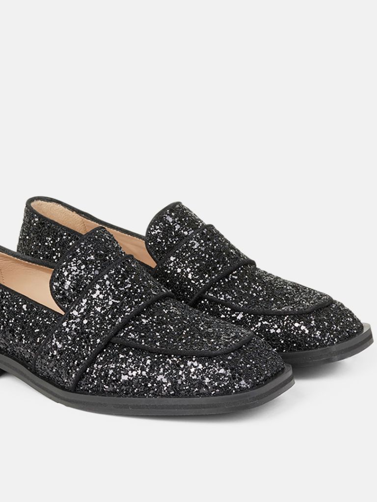 Neue Glitzer Loafer von Angulus ist ein wirklicher Hingucker. Durch die Luftpolstersohle im Innenschuh ist ein super angenehmer Tragekomfort gewährleistet. Die stylische Form mit der leicht abfallenden Spitze und der kantigen Form machen diesen Loafer sehr modern. Er hat eine normale Passform.