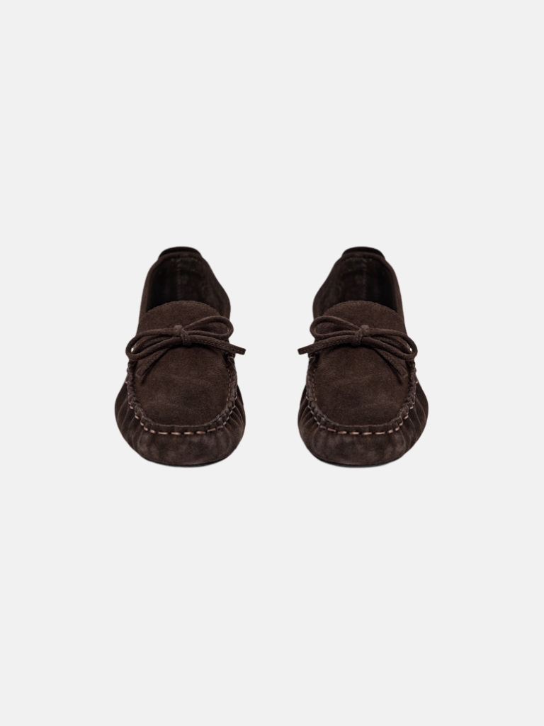 Dieser Mokassin in Dark Brown überzeugt mit seinem klassischen Design und einer hochwertigen Verarbeitung aus Leder in edler Wildlederoptik. Die runde Front mit sichtbarer Naht unterstreicht den typischen Moccasin-Stil, während die dekorative Schnürung dem Modell eine lässige, zeitlose Note verleiht.