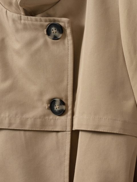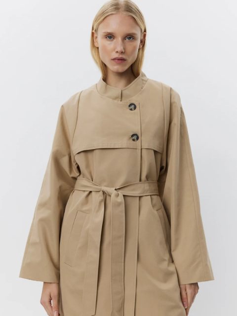 Dieser lange Trenchcoat in elegantem Camel-Ton ist ein zeitloser Klassiker, der mit seinem regulären Schnitt für eine moderne Silhouette sorgt. Er ist mit einer Knopfleiste, zwei grossen Taschen und einem Bindegürtel in der Taille gestaltet, der für eine feminine Passform und zusätzlichen Tragekomfort sorgt. Ein vielseitiges Must-have, das sich perfekt sowohl im Alltag als auch zu besonderen Anlässen kombinieren lässt.