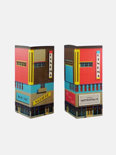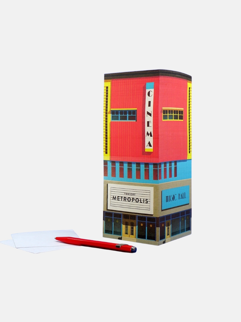 Natürlich läuft im Kino „Metropolis“ – das bahnbrechende Meisterwerk des deutschen Expressionismus, ein Film, der wie dieses Gebäude eine Vision der Zukunft repräsentiert. Ein Hauch von Nostalgie und Art Déco für Ihren Schreibtisch!
