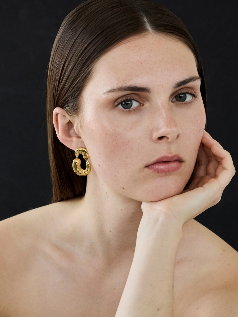 Der Viona Ohrring ist ein ausdrucksstarkes, kunstvolles Statement-Piece, das durch seine harmonische Balance aus Stärke und Eleganz besticht. Zwei grosse, organisch geformte Elemente verbinden sich in einer fliessenden Bewegung zu einem Design, das an flüssiges Metall erinnert. Die glänzende, lebendige Oberfläche verleiht dem Schmuckstück Tiefe und Charakter, während seine überraschende Leichtigkeit für hohen Tragekomfort sorgt.
