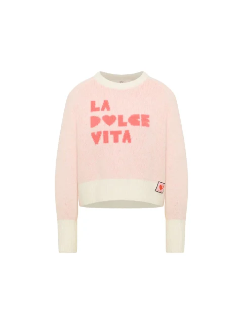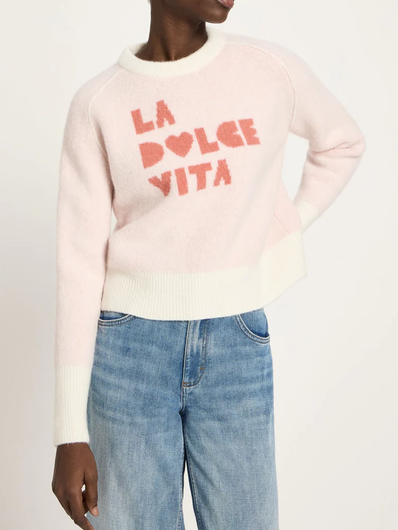 Der Jacquard-Strickpullover „La Dolce Vita“ von Lanius erinnert an unbeschwerte Tage unter der Sonne Italiens. Das verspielte Schriftmotiv trifft auf einen modernen Cropped-Schnitt, während zarte Pastelltöne in Offwhite und Peach für natürliche Leichtigkeit sorgen. Gefertigt aus einer edlen Mischung aus Alpaka und Merinowolle überzeugt der Pullover durch angenehme Wärme, weichen Griff und hohen Tragekomfort. Der feine Jacquard-Strick verleiht der hochwertigen Naturfaserstruktur zusätzliche Tiefe. Ein Statement für stilvolle Nachhaltigkeit – perfekt zu High-Waist-Hosen, Jeans oder fließenden Röcken.