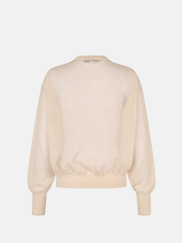 Fein gestrickter Pullover aus einem weichen Viskose-Mix mit zarter, leicht transparenter Struktur. Das Modell verfügt über eine Bindeschließe vorne sowie Rüschen entlang der Vorderseite, die dem Design eine feminine Note verleihen.