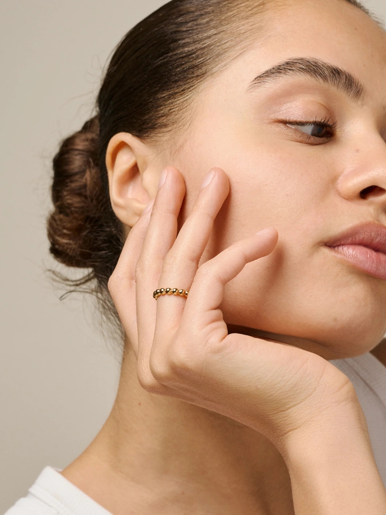 Der Ball Ring aus 18k vergoldetem 925er Sterling-Silber vereint klassische Eleganz mit modernem Design. Inspiriert von unseren beliebten Ball Hoops, greift er das charakteristische Perlenmuster auf und verleiht ihm einen zeitgemässen, stilvollen Ausdruck. Der Ring ist grössenverstellbar und lässt sich individuell anpassen – ideal für den täglichen Gebrauch oder zum Kombinieren mit anderen Ringen für einen trendigen Layering-Look.