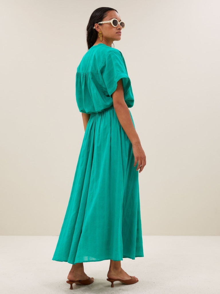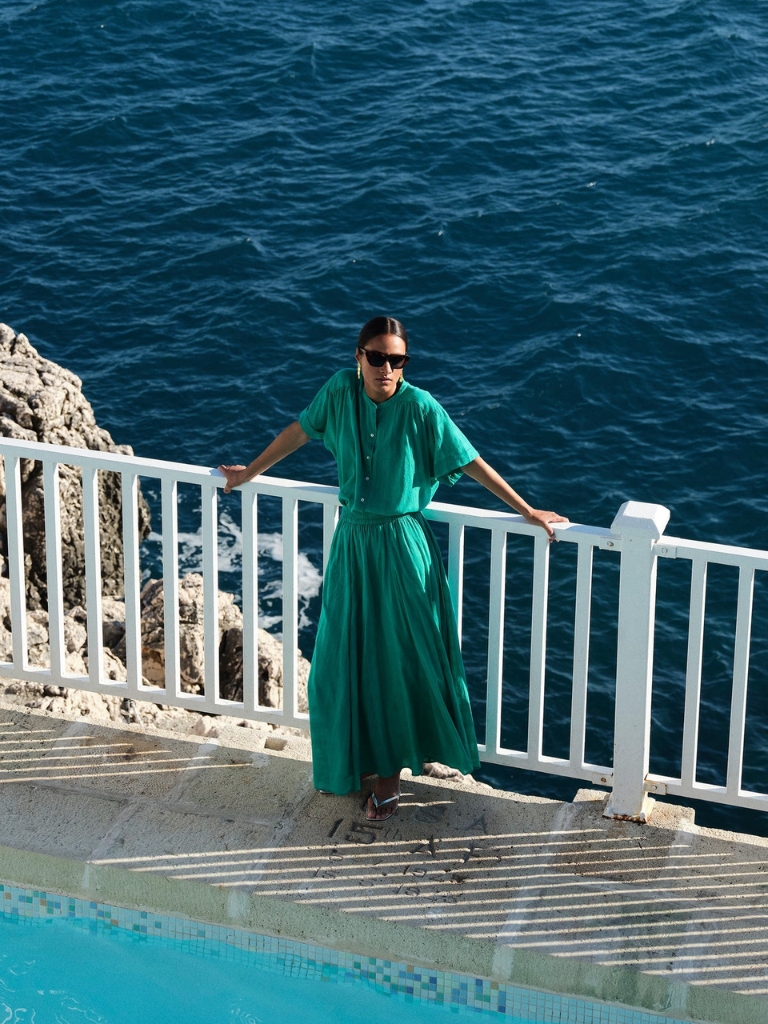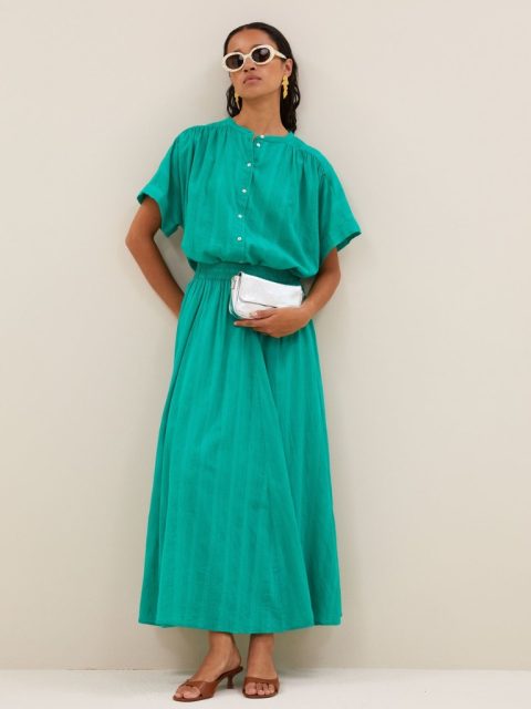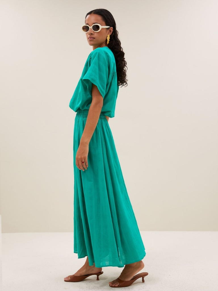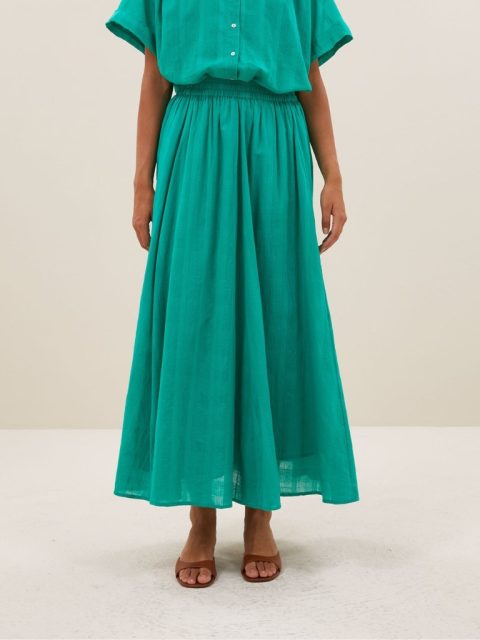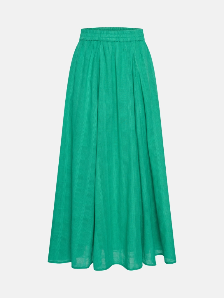 Der Ruby Dobby Rock überzeugt mit seiner eleganten, locker fallenden Silhouette und vereint Komfort und Stil auf mühelose Weise. Die wadenlange Länge sorgt für eine feminine Ausstrahlung, während das schlichte, einfarbige Design zeitlos und vielseitig kombinierbar ist.