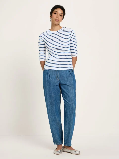 Dieses Halbarmshirt aus GOTS-zertifizierter Bio-Baumwolle bringt frische Leichtigkeit in den Alltag. Das feine Streifenbild wirkt ruhig und modern zugleich, während die halblangen Ärmel dem Shirt eine entspannte, zeitgemäße Silhouette verleihen. Die weiche, atmungsaktive Qualität sorgt für ein angenehmes Tragegefühl – ideal für warme Tage oder als unkompliziertes Layering-Piece in der Übergangszeit. Ob zur Jeans, zur Stoffhose oder zum Rock: Dieses Shirt lässt sich vielseitig stylen und bleibt dabei immer mühelos stilvoll.