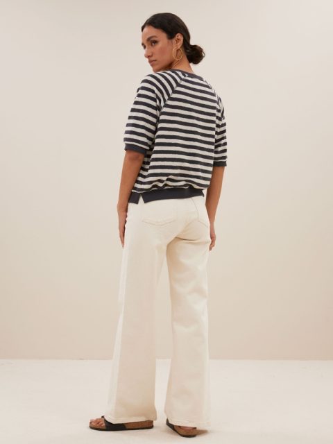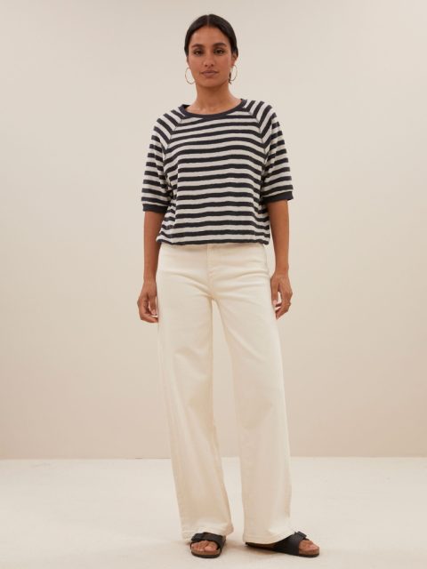 Das Neva Slub Stripe Shirt von by-bar ist ein bequemes Oberteil mit rundem Ausschnitt. Das Oberteil hat kurze Ärmel und ist sowohl an der Unterseite der Ärmel als auch am unteren Ende des Oberteils mit einem gerippten Rand versehen. Auf beiden Seiten der Oberseite befindet sich ein Schlitz. Das Oberteil besteht aus einer feinen Mischung aus Bio-Baumwolle und recyceltem Polyester und ist ein echtes Must-Have-Essential.