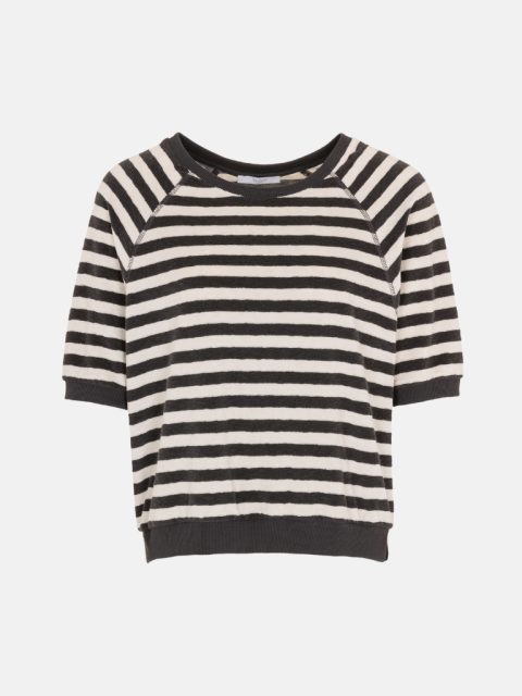 Das Neva Slub Stripe Shirt von by-bar ist ein bequemes Oberteil mit rundem Ausschnitt. Das Oberteil hat kurze Ärmel und ist sowohl an der Unterseite der Ärmel als auch am unteren Ende des Oberteils mit einem gerippten Rand versehen. Auf beiden Seiten der Oberseite befindet sich ein Schlitz. Das Oberteil besteht aus einer feinen Mischung aus Bio-Baumwolle und recyceltem Polyester und ist ein echtes Must-Have-Essential.