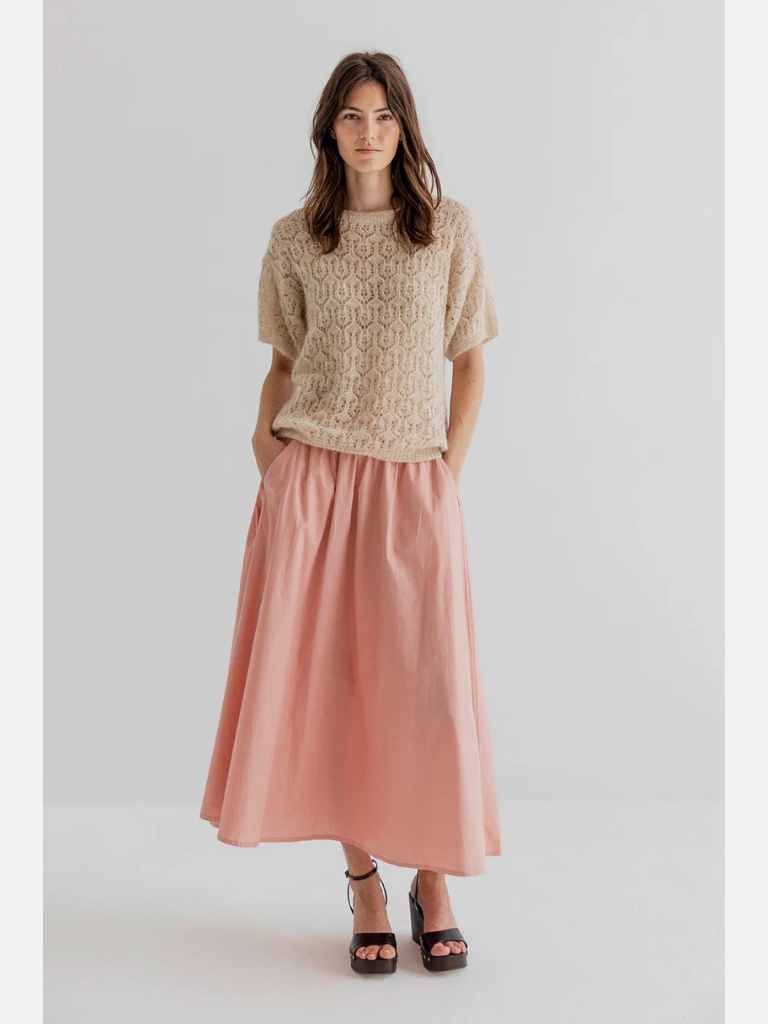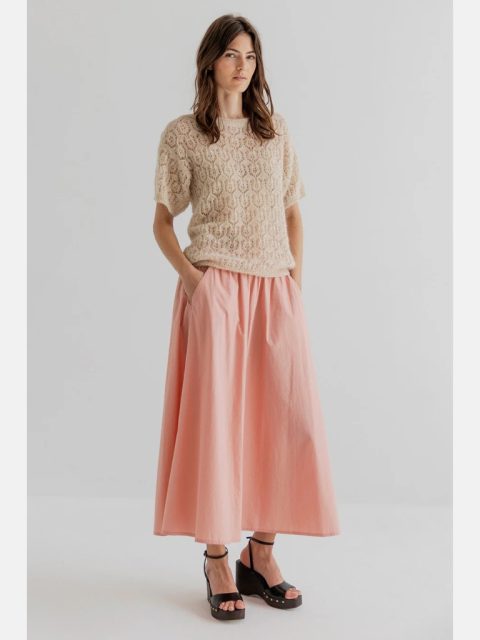 Project AJ117- Shirt PETRA ist ein zartes, kurzärmeliges Strickstück mit einem luftigen Pointelle-Muster und einer weichen, leicht kastenförmigen Form. Die Textur verleiht ein leichtes und offenes Gefühl und fügt der Oberfläche feminine Details hinzu. Style es solo oder füge die Petrine-Strickjacke hinzu, um ein komplettes Set zu bekommen.