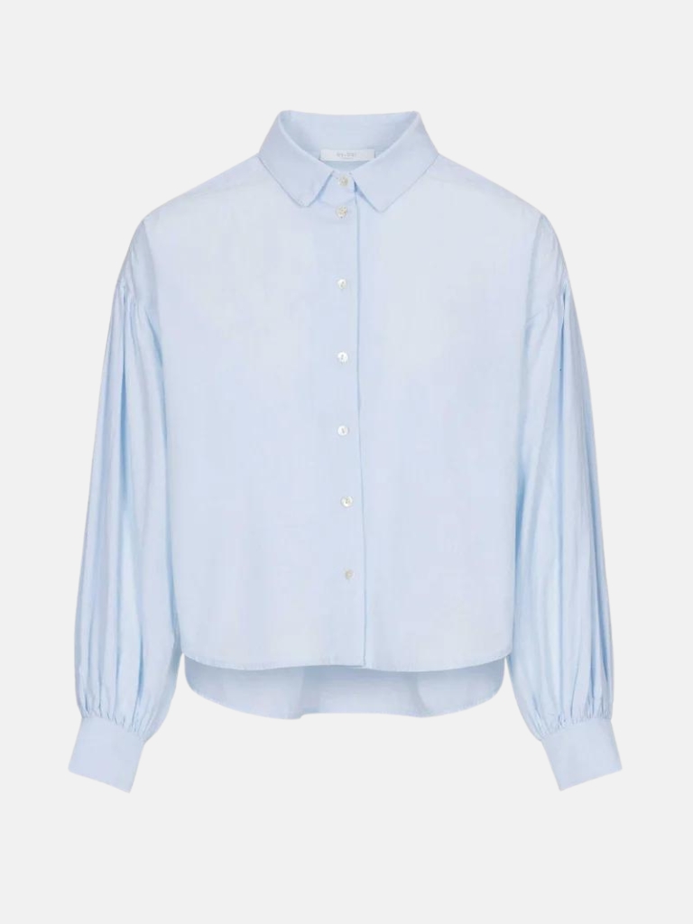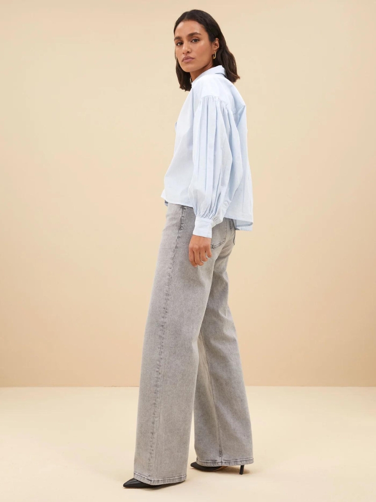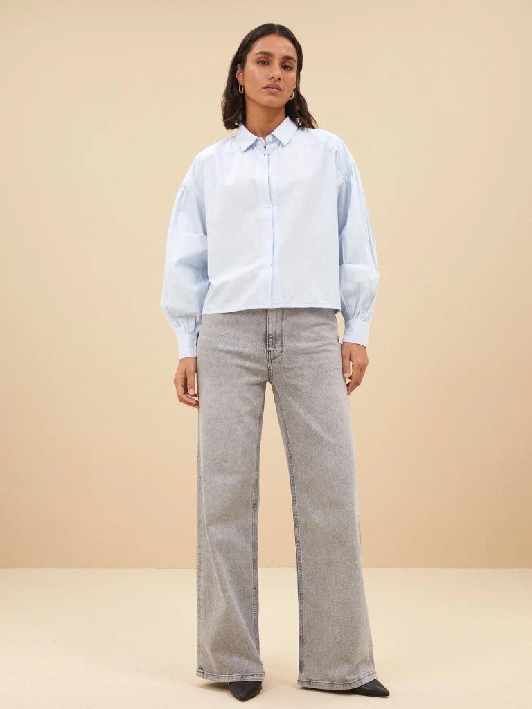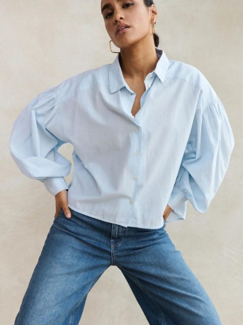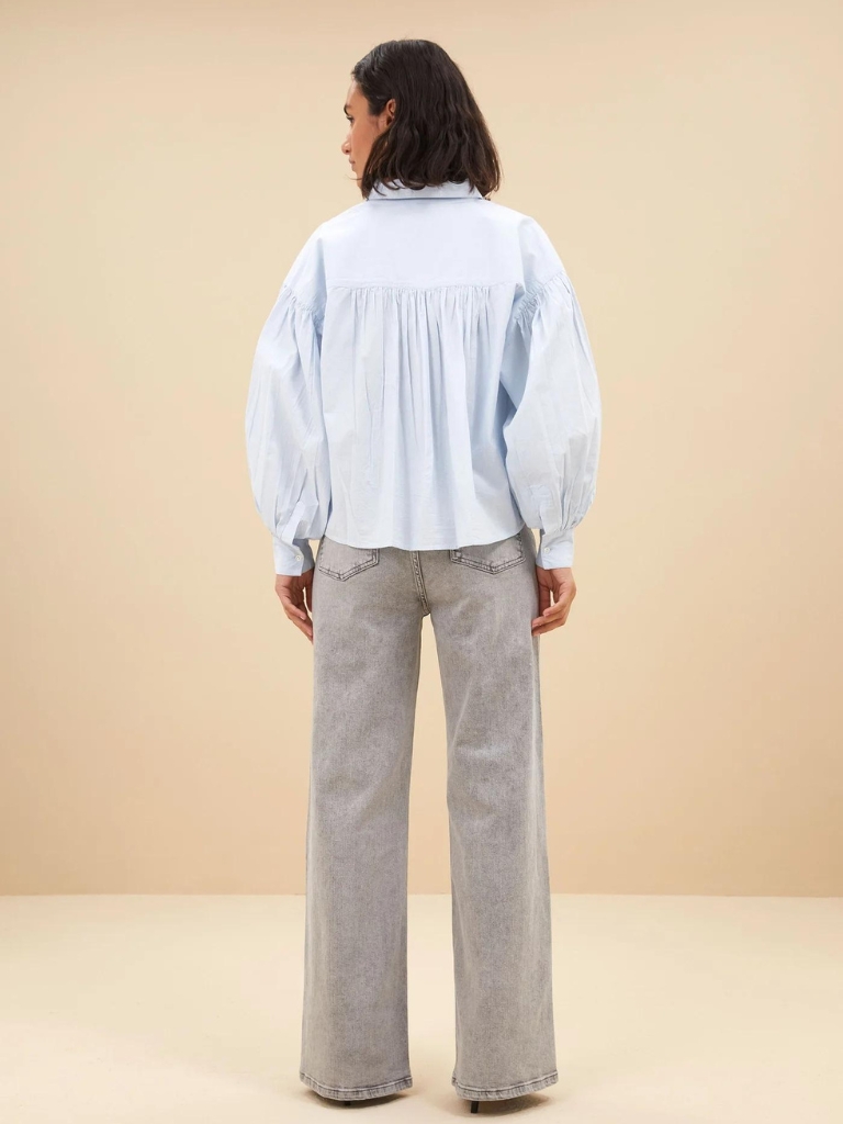Die kurze Chambray-Bluse Sarah ist ein echtes Must-have-Kleidungsstück. Die Bluse besteht zu 100 % aus feiner Baumwolle. Die Oversized-und kurze Passform, die tiefen Schulternähte mit Puffärmeln und der Rundhalsausschnitt mit Knopfleiste verleihen der Bluse eine elegante Note.
