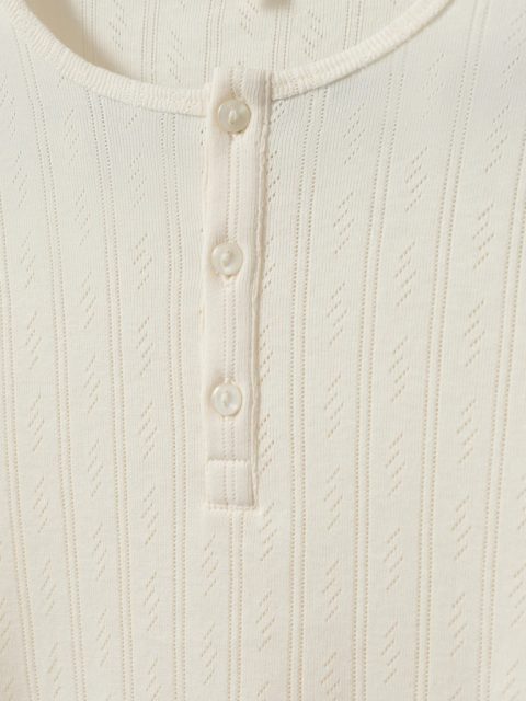 Klassisches Langarmshirt mit feinem Pointelle-Muster und rundem Halsausschnitt. Eine hübsche Knopfleiste vom Hals bis zur Brust verleiht dem Design eine feminine Note. Das zarte Pointelle-Muster sorgt für ein elegantes Erscheinungsbild, während das leicht elastische Material eine angenehme Passform bietet und die Form zuverlässig beibehält. Ein vielseitiges Basic für jeden Tag.