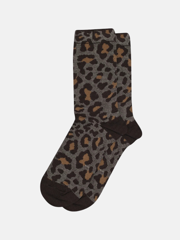 Baumwollsocken mit durchgehendem Leopardenmuster. Ferse und Spitze sind in einer einfarbigen, kontrastierenden Nuance gestaltet.