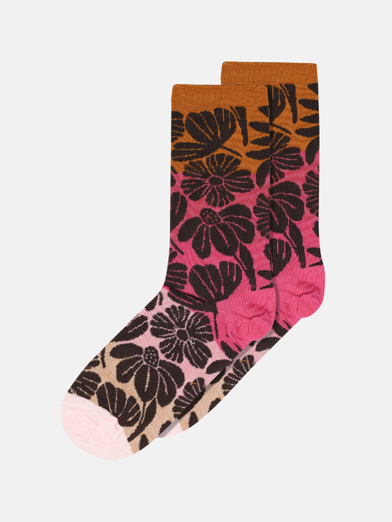 Gemusterte Socken aus Baumwolle und Viskose von mpWoman. Die Socke selbst besteht aus Viskose, während das schöne Blumenmuster aus Baumwolle gefertigt ist. Die Socke hat einen elastischen, umgeschlagenen Rand oben, der für einen bequemen Sitz sorgt, ohne am Bein zu eng zu sein.
