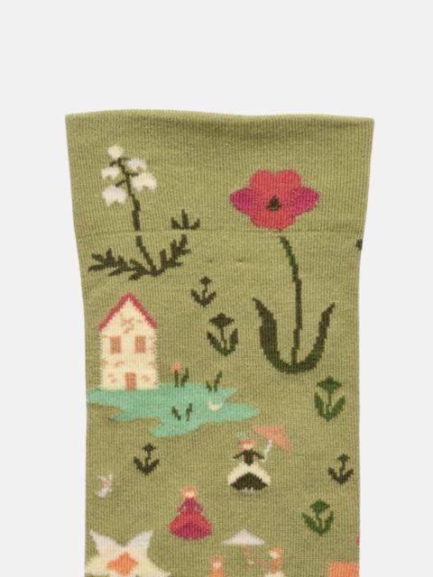 Die Socken von Bonne Maison überzeugen mit einem verspielten Allover-Blumenmuster in frischen Farben auf grünem Grund. Kontrastfarbene Spitzen und Fersen setzen einen zusätzlichen Akzent. Die halbhohen Socken sind fein gestrickt, angenehm leicht und ideal für den Alltag oder als besonderes Detail zum Outfit.
